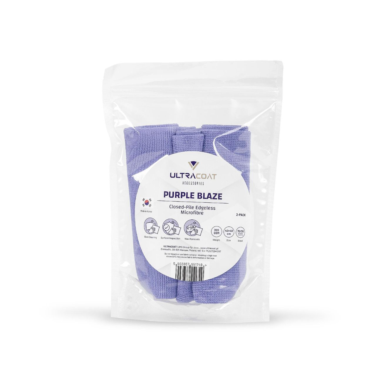 Purple Blaze е микрофибър без ръбове със затворен косъм за използване при обезмасляване на повърхности, измиване на прозорци и замазване на остатъци от восъци и полиращи пасти.